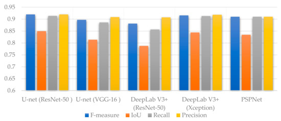 The performance of the proposed segmentation model (U-Net based on a pretrained ResNet-50) for mapping date palm trees was compared with different state-of-the-art fully convolutional networks, including U-Net (VGG-16 backbone network), DeepLab V3+ (ResNet-50 backbone network), DeepLab V3+ (Xception backbone network), and PSPNet (ResNet-50 backbone network). Figure 7 displays the evolution of the loss and dice similarity coefficient curves of the proposed approach over the epochs. Several accuracy measures, including precision, recall, F-score, and Mean-IOU metrics, were applied to the validation dataset for all models to evaluate the performance of the proposed architecture against other segmentation architectures quantitatively, as shown in Figure 8. Among them, the proposed model outperformed other segmentation architectures, followed by PSPNet, DeepLab V3+ (Xception backbone network), U-Net (VGG-16 backbone network), and DeepLab V3+ (ResNet-50 backbone network). The proposed approach achieved an F-score, Mean-IOU, precision, and recall of 92%, 85%, 0.92, and 0.91, respectively. A precision metric of 0.92 indicates positive detections relative to the labeled data (consistency of 92% between 2300 labeled and predicted images).