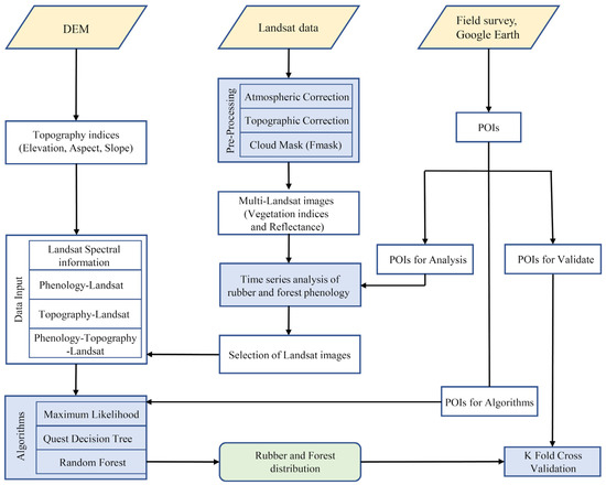 Accordingly, our spectral bands were classified into three groups: Landsat spectral band information (7 non-thermal bands: coastal aerosol, blue, green, red, NIR, SWIR1, and SWIR2), vegetation indices derived from phenological information (EVI, NDVI, and LSWI), and topographic indices (elevation, slope, and aspect). To investigate the performance of the three classification methods and the input information of spectral, phenology, and topography, four kinds of input data have been assessed for each classification: bands of Landsat images, phenology information (e.g., and for EVI), topographic indices, and phenology and topography information (combined phenology and topographic indices), which finally produced twelve outcomes. We recorded input data for the classification of Landsat spectral bands (L), phenology–Landsat spectral bands (PL), topography–Landsat spectral bands (TL), and phenology–topography–Landsat spectral bands (PTL). For clarity, we recorded each according to the input data and the classification approach, e.g., the images classified by the RF algorithm with the input information of PL would be recorded as PL–RF classification. We ran all classifications in the ENVI environment.