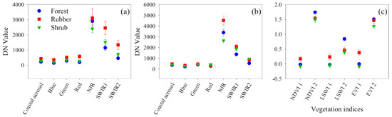 The reflectance of Landsat OLI images with seven spectral bands (coastal aerosol, blue, green, red, NIR, SWIR 1, and SWIR 2) and the six indices based on the NDVI, LSWI, and EVI of natural forests (Forest), rubber plantations (Rubber), and shrublands (Shrub) during the rubber defoliation and refoliation stages. Based on the temporal profile of vegetation indices, the Landsat OLI image in 7 February 2019 was selected for signature analysis of the defoliation: (a), the Landsat OLI image in 12 April 2019 was selected for that of the refoliation; (b), the six indices based on of the NDVI, LSWI, and EVI in the two different stages of natural forest, rubber plantations and shrublands; (c), NDVI1 is , NDVI2 is , LSWI1 is , LSWI2 is , and EVI1 is , EVI2 is .