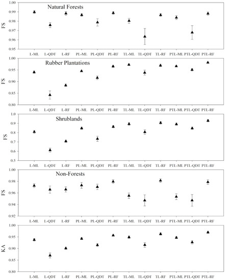 The stability and accuracy of RF were higher than that of QDT and ML algorithms for mapping rubber plantations, with a smaller SD (Figure 5). While comparing the SD, we found both the ML and RF had a smaller SD than the QDT classifier, which indicated that the QDT classifier had a lower stability and a lower accuracy, which was consistent with that of Xu et al. (2005) and Han et al. (2015) who found that the decision tree classifier not only may suffer from overfitting, but that its accuracy was also lower than that of RF [45,46]. A higher stability and accuracy were achieved by the RF based on the input data of PL, TL, and PTL. However, L-RF showed the lowest accuracy, which might relate to underfitting arising from the limited data inputs to the classifiers [47]. The higher stability of the RF may relate to the algorithm’s use of training data in order to develop trees, which was repeated more than 500 times in order to vote for each new datum input, with the most voted new datum input then produced for the final results [48,49,50]. The RF reduced overfitting and increased stability by the number of trees [51]. Due to the higher accuracy and stability of RF, we recommend using RF classifier-based phenological and topographical information for mapping rubber plantations.