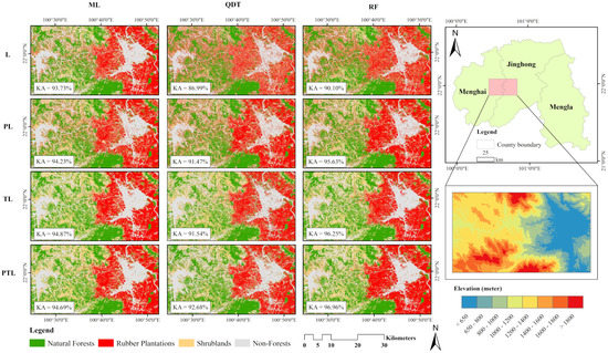 We further tested the three classifiers with four kinds of input information from Xishuangbanna (Figure 5 and Figure 6). The RF performed better than the other two classifiers. The PTL-based RF achieved the highest KA (Table 2). The QDT achieved higher KA when classified with PTL compared to the other three data input (L, TL, and PL) (Table 2 and Figure 5). However, the ML achieved higher KA when classified with TL. Without considering topography, rubber plantations were distributed across higher elevations using the RF classifier with L and PL compared to that with TL and PTL (Table 2, Figure 5 and Figure 6).