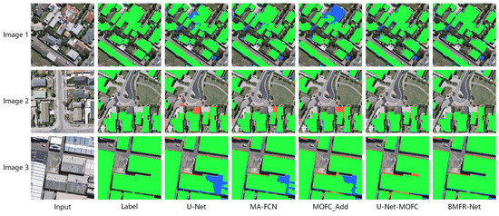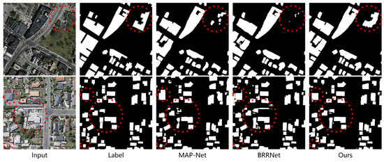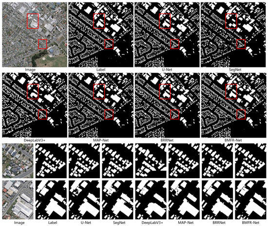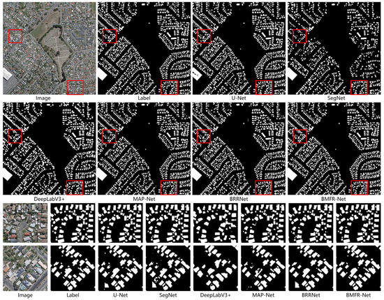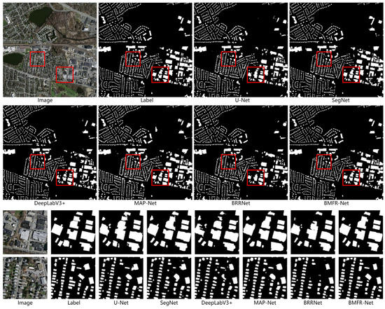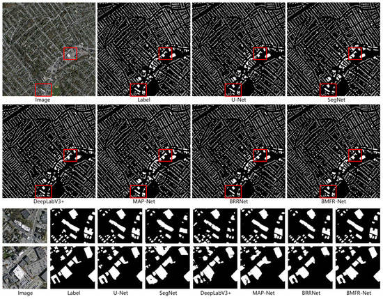 We compared BMFR-Net to the other five SOTA approaches, including U-Net [34], SegNet [33], DeepLabV3+ [48], MAP-Net [31], and BRRNet [32], to further assess the efficacy of the introduced network in this paper. We chose U-Net as one of the comparison methods since BMFR-Net uses U-Net as its main backbone. The SegNet was selected as the comparison method since it has the same encoding and decoding structure as U-Net and has a unique MaxPooling indices structure. Besides, the DeepLabV3+ is the latest structure of the DeepLab series network, which has a codec structure and includes an improved Xception structure and an ASPP module. Considering that the residual structure and atrous convolution have a profound impact on the development of neural networks, we selected BRRNet, a building extraction network based on U-Net and the integrating residual structure and atrous convolution. Moreover, we also used MAP-Net as a comparison method, which is an advanced network for building extraction.
