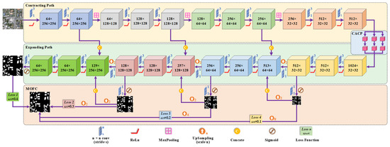 Inspired by FPN [41], the MOFC structure is designed to solve the above problems, and its structure is shown in Figure 5. In this paper, we took U-Net as the main backbone. Firstly, the MOFC structure uses a convolution layer with kernel size 1 × 1 and the sigmoid activation function for prediction production at the end of each level of the expanding path, as shown by the purple arrow in Figure 5. Next, the predicted results except the last level are upsampled twice. Then, as shown by the red arrow in Figure 5, the upsampling feature map is connected with the feature map of the adjacent level that has the skip connection. Moreover, except for the last level, the output results are upsampled to the size of the input image and evaluated with the ground truth to construct the multilevel joint weighted loss function, as shown in the orange arrow in Figure 5. In the end, the building extraction result is generated at the end of the network.