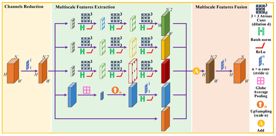As shown in Figure 4, the CACP module is made up of three small blocks: feature map channel reduction, multiscale feature extraction, and multiscale feature fusion. To begin, in the block of feature map channel reduction, the input channel number of the feature map is reduced by half to reduce the calculation amount. Following that, the reduced feature maps are fed into the multiscale feature extraction block, which extracts multiscale features through five parallel branches. The first three branches are continuous small-scale atrous convolution branches. In this paper, the dilation rates of the three branches are (1,2,3), (1,3,5), and (1,3,9). The gridding phenomenon is alleviated and local information such as texture and geometry loss is effectively minimized by placing HDC constraints on the dilation rate of continuous atrous convolution. The fourth is the global average pooling branch, which is used to obtain image-level features. The fifth branch is designed as a residual [40] branch to integrate the original information and facilitate the error backpropagation to the shallow network. Besides, the batch normalization and ReLu activation functions are performed after the atrous convolution process. Finally, the extracted features are fused by pixel addition in the multiscale features fusion block and the channel number of the feature map is restored to its target number.