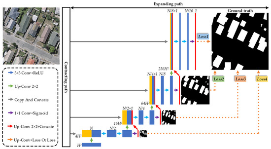 In terms of the category of optimizing the upsampling stage of FCN, they provide more semantic information of a multiscale context for the upsampling stage, allowing it to recover part of the semantic information and improve the segmentation accuracy. SegNet [33] records the location information of max values in the MaxPooling operation by using the pooling indices structure and recovers it in the upsampling stage, which improves the segmentation accuracy. By fusing low-level detail information in the encoding stage with high-level semantic information in the decoding stage, Ronneberger et al. [34] proposed a U-Net network model based on the FCN structure, which enhanced the accuracy of building extraction. Since then, multiple building extraction networks based on U-Net have been created, such as ResUNet-a [35], MA-FCN [36], and U-Net-Modified [37]. Nonetheless, these networks that improve the upsampling stage usually only predict via the last layer of the network. It fails to use feature information from other levels fully. For example, multiscale semantic information from the context, including color and edge from high-level and low-level output results, cannot be aggregated. Thus, buildings with similar spectral characteristics to nearby ground objects cannot be detected accurately. Although the MA-FCN outputs at each level of the expanding path and fuses multiple output results at the end of network, the large-scale upsampling operation is not precise enough, which will integrate too much invalid information and reduce the network performance. Moreover, the existing FCNs always have a large number of parameters and a deep structure. Suppose the network is constrained only by the results of the last layer. In that case, the update range of the parameters faring away from the output layer will be significantly attenuated due to the distance, thereby weakening the semantic information of the abstract features and reducing the performance of the network. As the second image in Figure 1 shows, the spectral characteristics of a building and its adjacent ground objects are similar. The existing methods cannot effectively distinguish them and get a false detection.