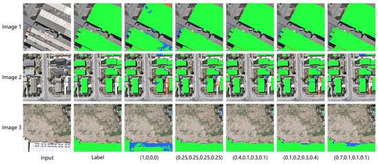 Typical building extraction results of BMFR-Net with different weight combinations of the multilevel joint constraint. In the graph, green represents TP, red represents FP, and blue represents FN.