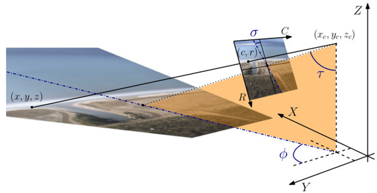 where is the camera position (or “point of view”) and , and are orthonormal vectors defined by the camera orientation, i.e., by the eulerian angles (azimuth), (roll) and (tilt) in Figure 1.