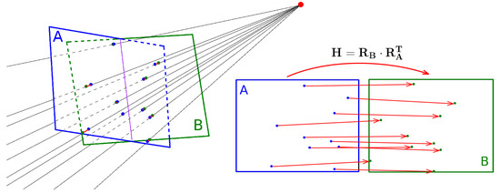Consider now two images captured at the same point of view (“A” and “B” in Figure 2) but with a different orientation of the camera (case 0) or, even, with different cameras (case 1). The points in the projective planes corresponding to the same ray, i.e., one same point in real space, can then be transformed by an “homography”. The relationship between the undistorted coordinates u and v corresponding to one spatial point as seen in two different images (“A” and “B”, with different angles and intrinsic parameters) is given by [42]: