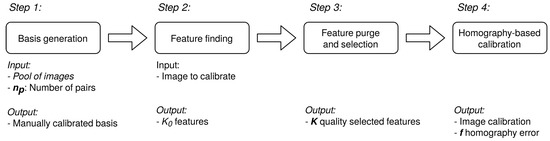 The automatic calibration of an image was performed in four steps that are schematized in Figure 3. First, a set of (manually) calibrated images is generated, which will be referred to as basis (step 1). Next, common features between the image to be calibrated and each of the basis images are identified (step 2). These pairs are then purged to remove erroneous matching features, and, from the remaining set of features, a selection is made (step 3). Finally, this selection is used to calibrate the image (step 4).