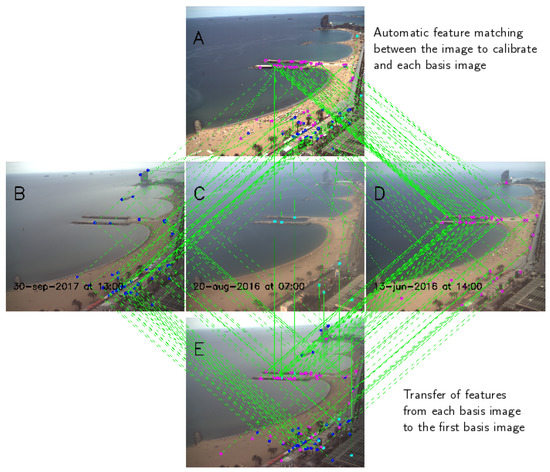 The number of images of the basis can be chosen arbitrarily (here, through the required pairs, ) and, the higher this is, the more images can be properly calibrated. All the automatic calibrations are performed directly through the basis of images, i.e., second or higher order generations of automatic calibrations have not been considered to avoid error accumulations. If the calibrations are to be applied to analyze the water zone (e.g., for bathymetric inversion), we recommend that the horizon line is introduced as an input in the basis calibration.
