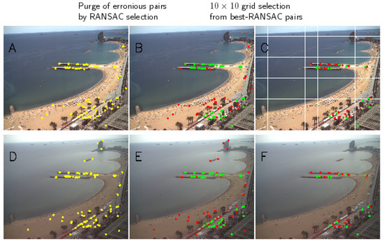 Automatic matching algorithms do not always succeed, as can be seen in the images of Figure 5A,D. Therefore, prior to obtaining the three unknown angles, a purge of erroneous pairs of features should be done. A RANSAC (RANdom SAmple Consensus) [44] is performed to the pairs undistorted coordinates using a homography as the model. In this way, a subset of pairs that actually correspond to the homography is obtained (green points in Figure 5B,E; the red dots being disregarded). Further, for the pairs to be more uniformly distributed along the image, out of the remaining pairs, only the best pairs (according to the homography) of each cell of a grid on image to calibrate are considered (green dots in Figure 5C,F). As a result, features were obtained for calibration.