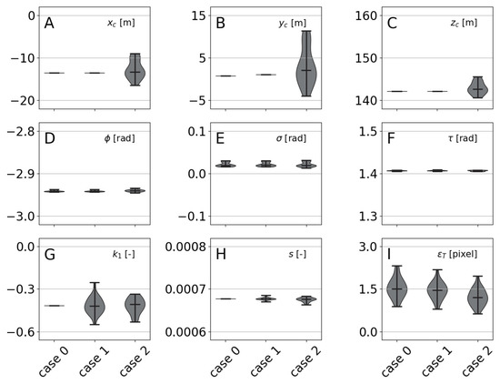 Histograms of the camera position (A–C) intrinsic parameters (G,H) and calibration error (I) for the calibration of the 24 images of BCN1 basis with and for cases 0, 1 and 2
