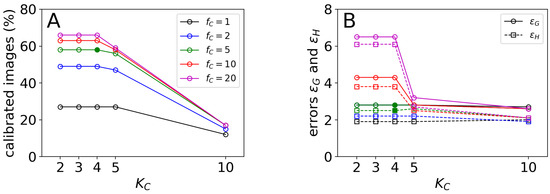 For , for which the basis had eight images, the remaining 59 control images were automatically calibrated: Figure 9 shows the percentage of images calibrated with and for different values of and . The more demanding conditions (smaller allowed and larger required number of pairs ), the smaller the percentage of the 59 images satisfying both conditions (“successful” images). As shown in Figure 9A, for the proposed values, this percentage ranges from , in the most demanding condition, up to in the most relaxed one.