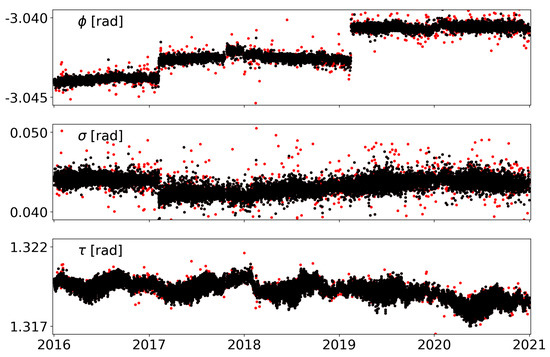 Figure 10 shows the results for and (black dots), showing that most of the outliers are avoided. In order to reduce the outliers in Figure 10 for and (all dots, red and black), one could alternatively try time filtering taking into account that the characteristic filtering time window has to be small enough not to filter the intra-day oscillations of the signal. In addition, from the results for all three stations, the more relevant questions to obtain a large percentage of good automatic calibrations appear to be: (1) the amount of fixed features observable in the images (BCN1 and BCN2 give better results than CFA1) and, less, (2) the image size (BCN2 works better than BCN1).