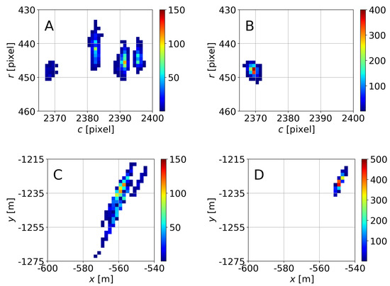 These results can be, alternatively, expressed in meters (Figure 12C,D). For this purpose, we considered that the feature was at . If all clicked pixel coordinates (Figure 12A) are projected into the -plane using a constant calibration (the first one, here), the resulting distribution is shown in Figure 12C. However, if the corresponding automatic calibrations are used for each pixel, the distribution is the one in Figure 12D, whose RMS of the distances to the center of mass is .