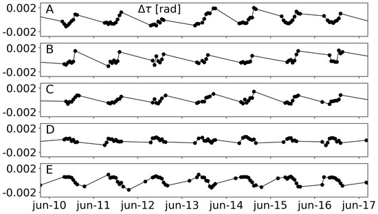 However, once the images have been (automatically) calibrated, it can be of use to shed some light on the possible mechanisms that cause the viewing angles to change. Pretending only to be illustrative, we consider the time evolution of (tilt) for the five cameras in station CFA1 (Figure 13); thus far, only the results for camera D in Figure 13 were shown for CFA1. Figure 14 shows the time evolution of the demeaned angle, , for the five cameras of CFA1 during 7 days in summer 2013. From the figure, the tilt behavior changed from camera to camera. Focusing on the outer cameras (A and E in Figure 13), e.g., while, for camera A, the tilt tended to increase during the daylight hours, the trend was the opposite for camera E, suggesting that the whole concrete structure had a (small) deflection that was captured by the cameras.