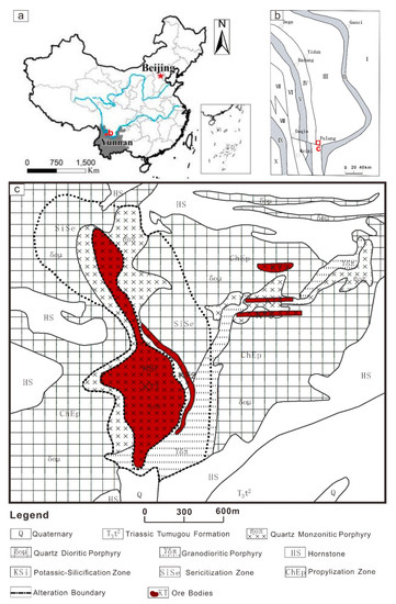 Geological map of the Pulang PCD (modification of the map reported by Wang et al. [52]). (a) Location map of the study area; (b) Tectonic map of the Yidun island arc; (c) Simplified geological map of the Pulang PCD. I—Yangtze plate; II—Ganzi-Litang plate junction belt; III—Yidun island arc; IV—Zhongza microblock; V—Jinsha River junction zone; VI—Janda-Wixi volcanic arc; VII—Changdu-Lanping block; VIII—Sanda mountain-Jinghong volcanic arc; IX—Lancang River junction belt; X—Baoshan block.