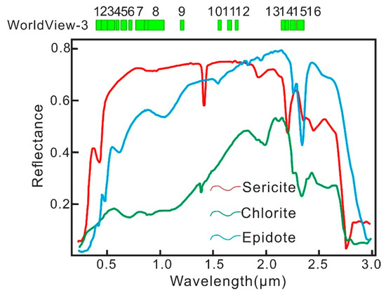 Spectral curves of sericite, chlorite, and epidote from visible to shortwave infrared spectra in WV-3 data (the spectral curves from the USGS spectral library version 7).