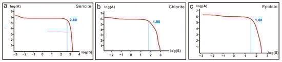 Log(S)-log(A) diagram of the sericite, chlorite, and epidote. (a) The fractal filter threshold of sericite is 2.80; (b) the fractal filter threshold of chlorite is 1.90; and (c) the fractal filter threshold of epidote is 1.60.