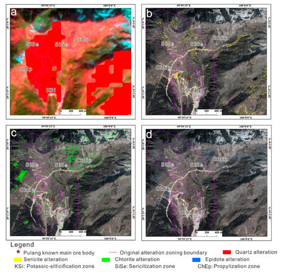 The identification results of the quartz alteration mineral are shown in Figure 5a. Figure 5b–d is the result of hydrothermal alteration minerals extracted using a combination of the PCA and S-A techniques along with WV-3 data. The extracted quartz alteration minerals are mainly concentrated in the inner part and southeastern region of the Pulang’s main ore body (Figure 5a); the extracted sericite alteration minerals are mainly distributed in the inner part, northeastern region, and southeastern region of the Pulang’s main ore body (Figure 5b); whereas the extracted chlorite and epidote alteration minerals are widely distributed in the outer part and northeastern region of the Pulang’s main ore body (Figure 5c,d).