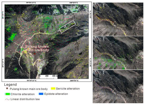 Distribution characteristics of alteration minerals extracted from area A and their linear patterns.