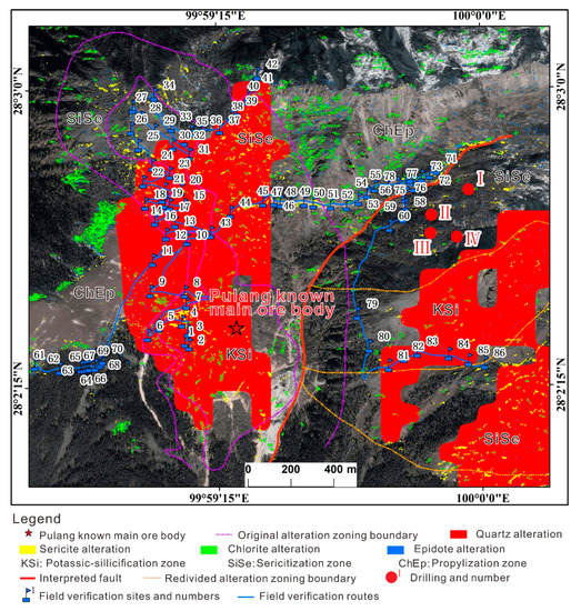 Comparison of the extracted alteration minerals with the original alteration zoning boundary shows that the distribution of the extracted quartz, sericite, chlorite, and epidote alteration minerals in the Pulang’s main ore body are basically consistent with the alteration zoning divided by the original alteration mapping. However, in the eastern region of Pulang’s main ore body where the alteration zone is classified as propylitic by the original alteration mapping, a large amount of quartz and sericite alteration minerals belonging to the potassic-silicification and phyllic zones were extracted. The phenomenon is inconsistent with the previous understanding of alteration minerals mapping.