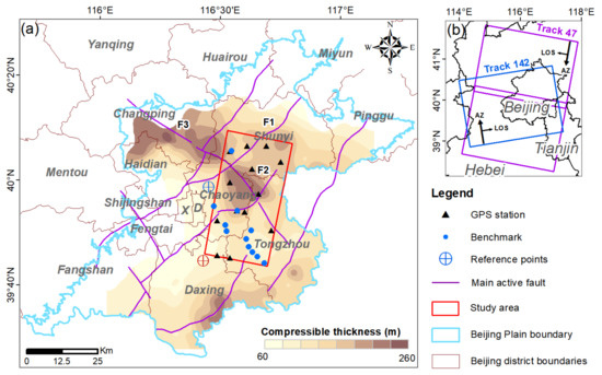 - Hu, L.; Dai, K.; Xing, C.; Li, Z.; Lu, Y. Land subsidence in Beijing and its relationship with geological faults revealed by Sentinel-1 InSAR observations. Int. J. Appl. Earth Obs. 2019, 82. [Google Scholar] [CrossRef]