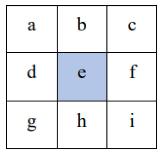 The slope depends on the rate of change (increment) of the surface in the horizontal and vertical directions starting from the central image element. The basic algorithm used to calculate the slope takes the values of the central image element and its eight adjacent images to determine the horizontal and vertical increments. These adjacent elements are determined using the letters a through (as shown in Figure 2), where e indicates the element for which the slope is currently being calculated.