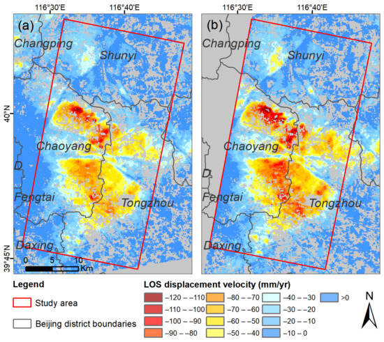 Annual LOS displacement maps from Sentinel-1. (a) PS-InSAR result of the ascending dataset; (b) PS-InSAR result of the descending dataset.