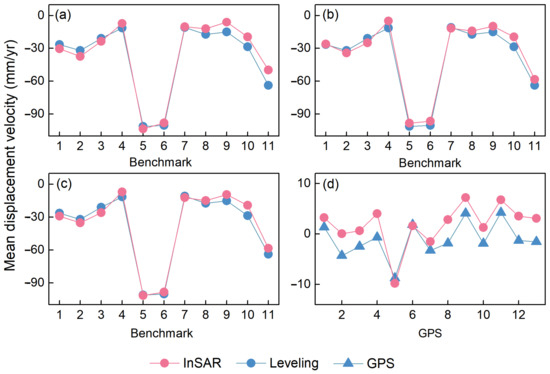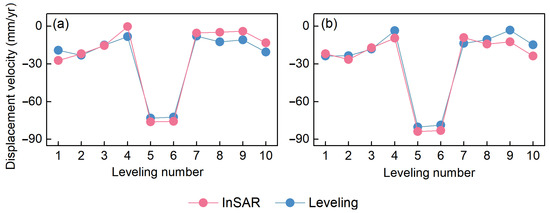 Comparison of the InSAR-derived surface displacement rates with those derived from GPS and leveling measurements. (a,b) Comparison of the ascending and descending InSAR LOS displacements, respectively, with the leveling measurements.