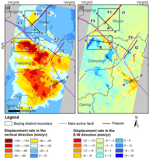 To further investigate the spatial characteristics of the east–west horizontal displacement, profile a–a′ was established through the Shunyi–Liangxiang fault in area A (Figure 7), and profile b–b′ was constructed through the subsidence center in area B. Figure 11 shows magnified views of the surface displacement in these two areas (marked with black rectangles in Figure 7).