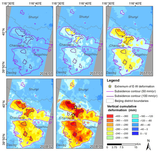 Time series maps showing the vertical cumulative displacement. (a: Extremum of west horizontal displacement; b: Extremum of east horizontal displacement).
