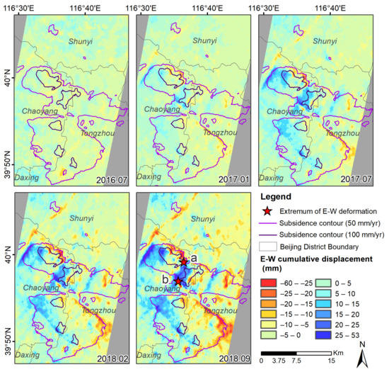 Time series maps of the east–west cumulative displacement. (a: Extremum of west horizontal displacement; b: Extremum of east horizontal displacement).