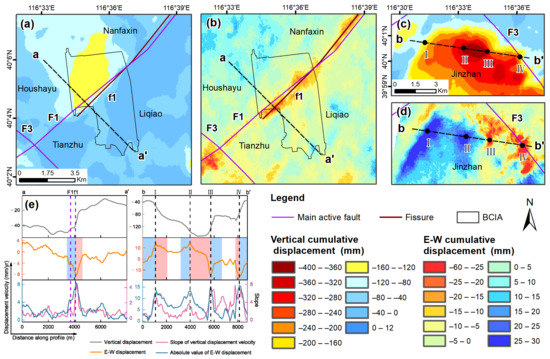 The left panels of Figure 11e show that the slopes of vertical displacement and the rates of east–west horizontal displacement increase closer to the Shunyi ground fissure in the vicinity of the airport, and the slopes and rates reach their peak at the main fissure. The peak horizontal displacement is −10 mm/year along profile a-a′, and the maximum differences between the two sides of the fissure are 28 mm/year in the vertical displacement rate and 6/year in the east–west horizontal displacement rate, with the horizontal displacement oriented toward the center of the vertical displacement area. Similar characteristics are also found for the Songzhuang ground fissure. According to the left panels of Figure 15 the vertical displacement slope and east–west horizontal displacement rate are larger closer to the ground fissure and reach their peak at the main fissure. The peak horizontal displacement along profile c–c′ is −7 mm/year, the maximum difference in the vertical displacement rate between the two sides of the ground fissure is 27 mm/year, and the maximum difference in the east–west horizontal displacement rate is 13 mm/year.