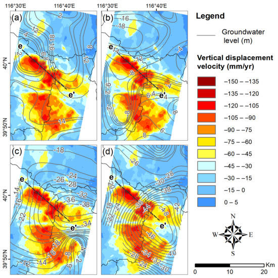 Spatial relationships between the groundwater level and vertical displacement. The contours in (a–d) represent the water levels of the unconfined aquifer, the first confined aquifer, the second confined aquifer and the third confined aquifer, respectively. e–e’ is displacement profile within depressions are marked by black dashed lines.