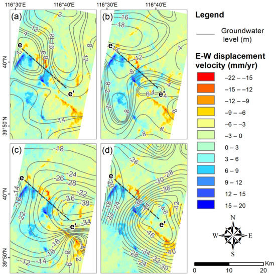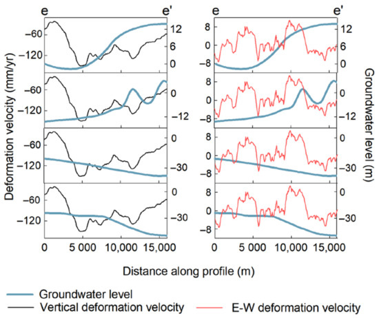 To further discuss the relationship between the groundwater level and surface displacement in each aquifer, profile e–e′ was established through the displacement center, and its location is shown in Figure 12. Figure 14 plots the vertical displacement rates and east–west horizontal displacement rates, respectively, versus the water level in each layer. The morphology of the groundwater sink in each aquifer does not exactly match the displacement area. Hence, we tentatively suggest that the groundwater level is responsible for the displacement in this area, but the spatial spread of displacement may be the result of the joint action of groundwater level variations and other factors.