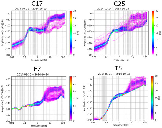 Initial analysis of noise data: every individual curve gives the power spectral density (PSD). Color bars display the probability of distribution of seismic power spectral density at different frequencies. Every plot represents the vertical component of one station (station ID at the top) during the entire recording time. Both high amplitudes and low signal variability can be observed mostly between 0.1 and 3 Hz.