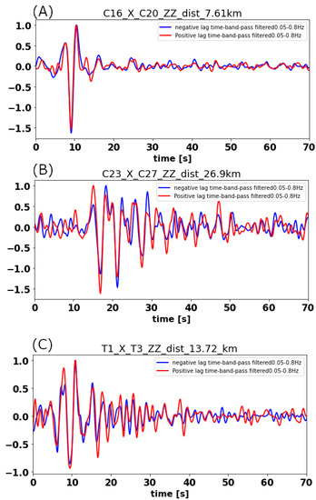 Comparison between the positive and negative lag time signals of station pairs (A) C16–C20, (B) C23–C27, and (C) T1–T3. The name of station pair, type of receiver (zz = vertical) and the inter-station distance in km is given at the top of every panel. Red lines show the positive lag time signal, flipped onto the negative time axis. The selected range of frequency is 0.05–0.8 Hz. The good overlap between positive and negative lag time signals confirms the symmetry in time domain cross-correlation and is taken as indication of the spatial homogeneity of source distribution.