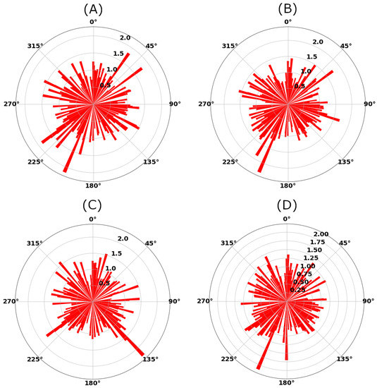 Rose diagrams of amplitude ratios for frequency bands: (A) 0.05–0.2 Hz, (B) 0.2–0.4 Hz, (C) 0.4–0.8 Hz, and (D) 0.05–0.8 Hz. The rose diagrams serve as proxy for the azimuthal distribution of noise sources.