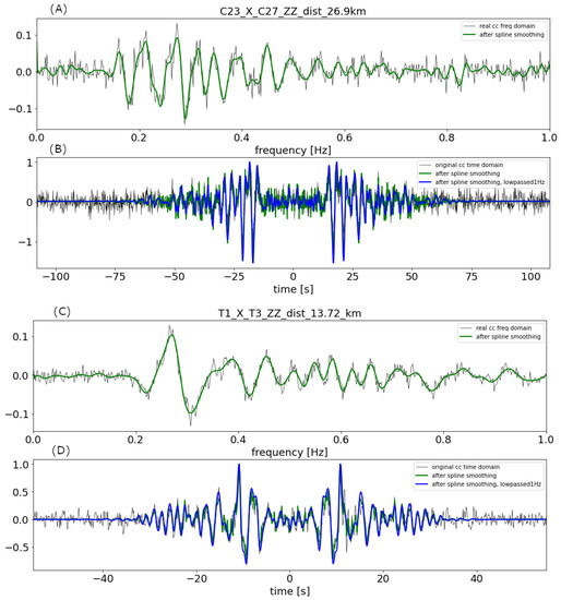 (A) Real part of the cross-correlation of station pair C23–C27 with an inter-station distance of 26.9 km in the frequency domain. (B) Cross-correlation of station pair C23–C27 in the time domain. (C) Real part of the cross-correlation of station pair T1–T3 with an inter-station distance of 13.72 km in the frequency domain. (D) Cross-correlation of station pair T1–T3 in the time domain. Smoothing (green line) helps to reduce the effect of spurious zero crossings [49]. The smoothed cross-correlations in the time domain (green and blue) are symmetric around time zero since the imaginary part of the frequency domain cross-correlation was set to zero prior to the inverse Fourier transform. According to the data analysis, the maximum range of frequency set to 1 Hz.