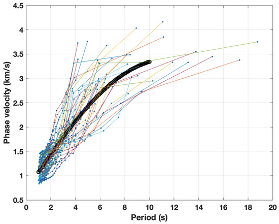 The picked phase velocity of every station pair is shown as colored lines. Blue circles are all the picked phase velocities. The thick black curve gives the average dispersion curve of all the picked data up to a maximum of 10 s.