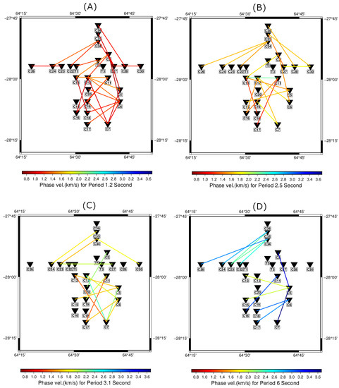 Phase velocity variations are indicated in (A) period 1.2 s, (B) period 2.1 s, (C) period 3.1 s, and (D) period 6 s. Reverse triangles indicate the location of the stations used in the final analysis. An increasing trend of the measured phase velocity from shorter to longer periods is observable.