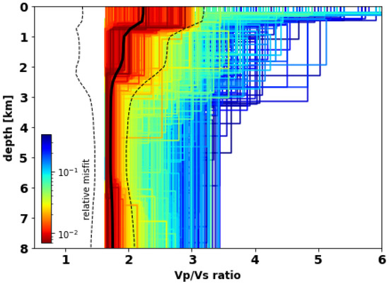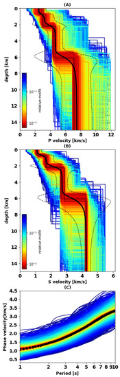 The model is parameterized in terms of thickness, shear wave velocity (Vs), compressional wave velocity (Vp), and density () for each layer. Among them, Vs has the most important role and exercises the least influence on the dispersion curve. The Poisson’s ratio, which links Vs and Vp, was allowed to vary between 0.2 and 0.5 as indicated in Table 1, according to the value of Poisson’s ratio for geological materials [60]. Vp and Vs are free parameters of the inversion. The Poisson’s ratio is not a free parameter, but if a solution is generated with Vp and Vs such that the value of the Poisson’s ratio is outside of the allowed range, that solution is discarded. We chose the following model search parameters: ns0 = 50, nr = 50 and generated 10,000 models in total. We chose to use four layers whose prior ranges (Table 1) were defined based on the Preliminary Reference Earth Model (PREM) [63] and on several test runs in which we made sure that the search algorithm would generate a reasonably wide range of models centered around the measured data (Figure 9C). The obtained P-wave and S-wave velocity models are shown in Figure 9A,B, respectively. The black lines represent the average of the 5000 models with the lowest misfit and will be used for interpretation. The shown Vs profiles are more reliable, because of the higher sensitivity of Rayleigh waves to Vs compared to Vp.