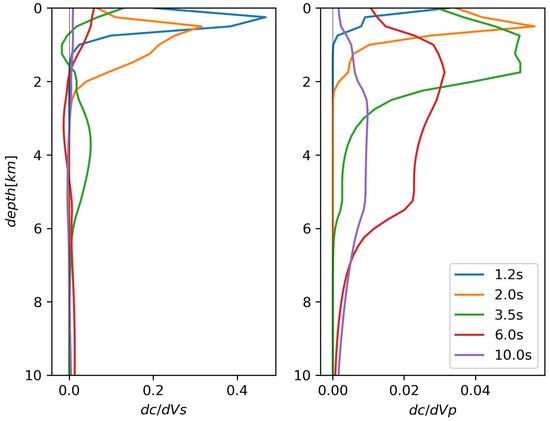 Sensitivity kernels relating Rayleigh-wave phase velocity estimates to Vs (left) and Vp (right) at depth. Note the difference in horizontal scale between the left and right panels: sensitivity of Rayleigh waves to Vp is one-order-of-magnitude smaller than their sensitivity to Vs, as expected. The reference assumed for the computation of the kernels is our final Vp, Vs profile (solid black lines in Figure 9A,B). Kernels were calculated via Keurfon Luu’s “disba” Python package.