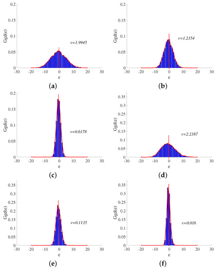 Similar to observation in Figure 4a, the probability density histograms of and shown in Figure 4b,c can also be approximated as the generalized Gaussian distributions.