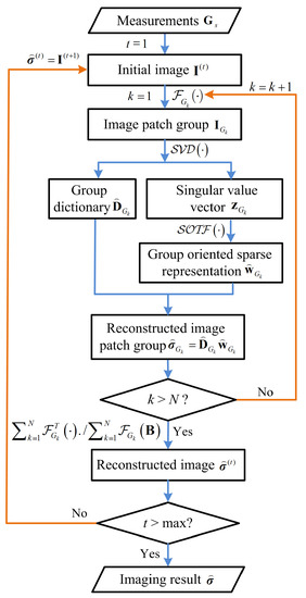 Only measurement and IPG set are available. However, we need to obtain the optimal group dictionaries and corresponding GOSRs . Similar to the joint optimization model in on-line DL-based sparse imaging described in Section 3, we reform the reconstruction model in Equation (16) as a joint optimization model as follows: