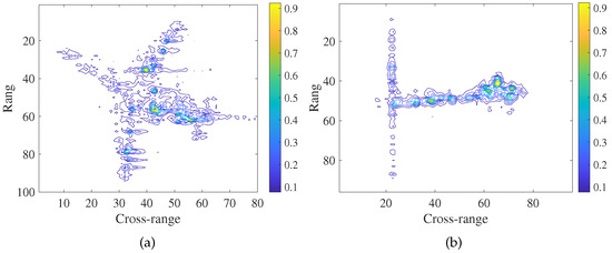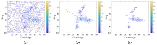 We consider an ISAR imaging geometry, including a moving radar platform and a target with both transnational motion and rotational motion, in an image projection plan (IPP). The radar first transmits a linear frequency modulated (LFM) pulsed waveform . Here, t represents the fast time, represents the pulse width, is the frequency modulation rate, is the carrier frequency of the transmitted waveform and is the rectangular function. The received signal from the target scene is then mixed with a reference chirp. After performing the operations of demodulation, range compression and motion compensation of higher order [23] on the de-chirped signal, the ISAR image formation can be formulated as a 2D inverse Fourier transform (FT) [9] as follows: