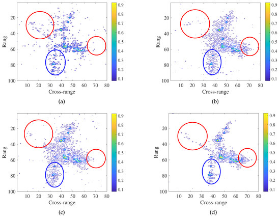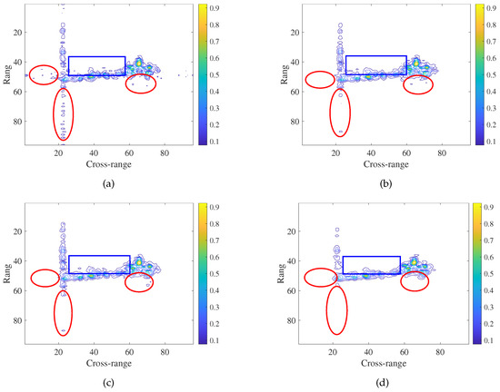 From Figure 9 we can see that the ship target can be reconstructed successfully, using these four methods. It shows the imaging results of the ship target obtained by the GKF, ONDL, OFDL, and GDL methods, using 50% measurements. By performing a further comparison of the regions indicated by red circles and blue rectangles, we see that the result shown in Figure 9d have the fewest artifacts or interferences.