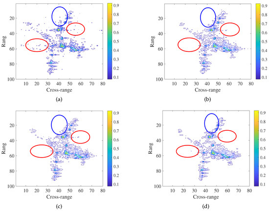 The target images of three data sets with different values of are shown in Figure 11, Figure 12 and Figure 13, respectively. From the Figure 11b, Figure 12b and Figure 13b; we can see that three data sets have the best image quality in the case of that equals 0.02, 0.03 and 0.035, respectively. The target images have the smallest number of artifacts and the best target shape. Furthermore, the quantitative indices of the three results are better than those of the results obtained by other imaging methods as shown in Table 3. Thus, the optimal values of for plane data 1 and plane data 2 as well as ship data 1 imaging can be set as 0.02, 0.03 and 0.035, respectively.