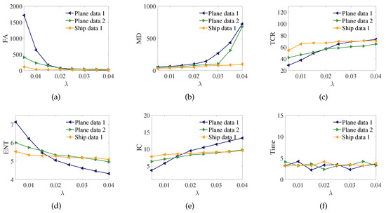 Figure 10 shows the variation of FA, MD, TCR, ENT, IC and Times with different values of , where other parameters, including , , , l, are kept constant for three data sets. We see that as the increases, the values of FA and ENT decrease, while the values of MD, TCR and IC increase. Note that all metrics but MD tend to the optimal situation with the increase in . The higher MD, in fact, indicates the sparser result, which means that the target structure details in the result may be missing, leading to the relatively bad appearance.